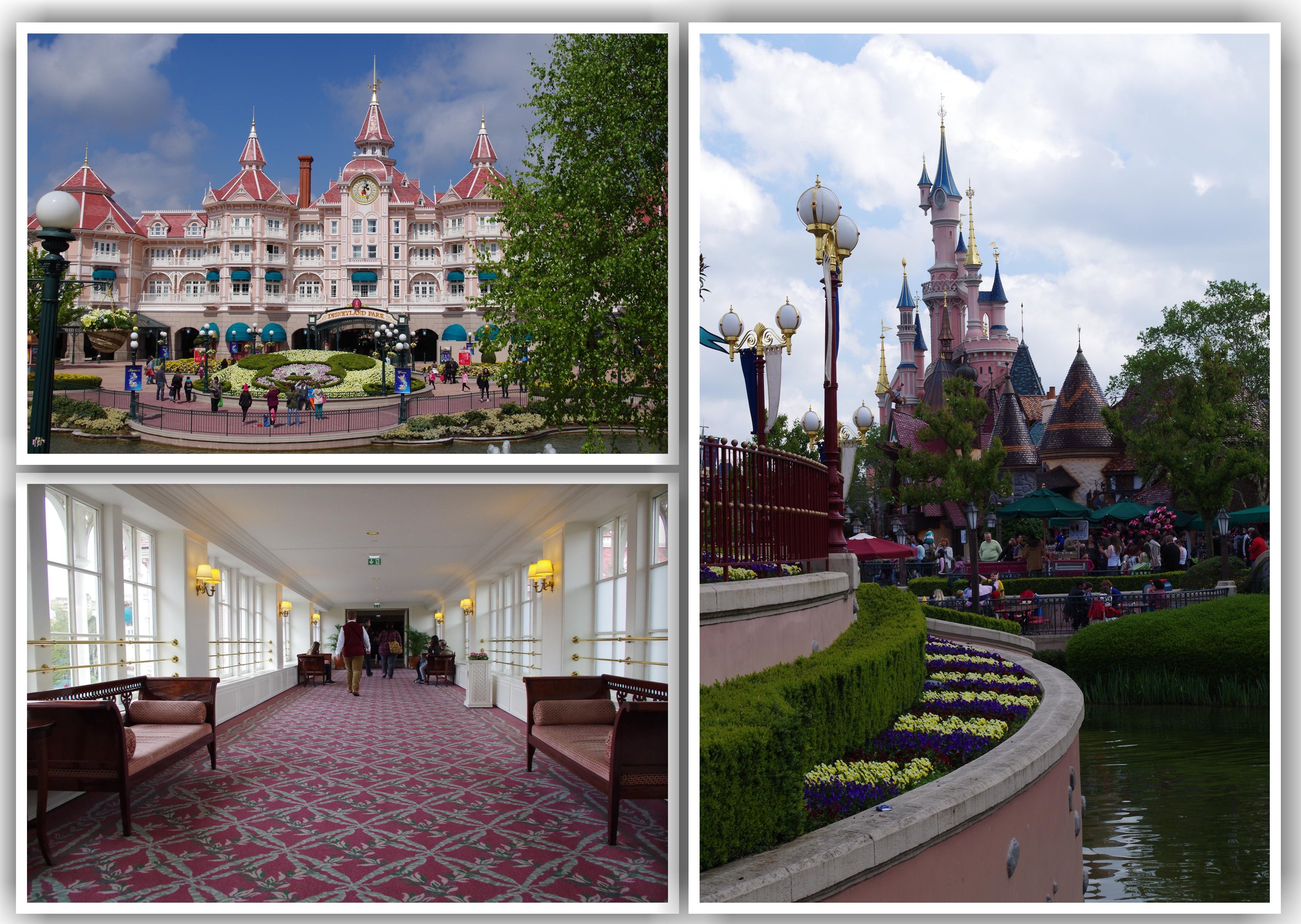 Inside and outside the Disneyland Hotel, and the castle from Fantasyland