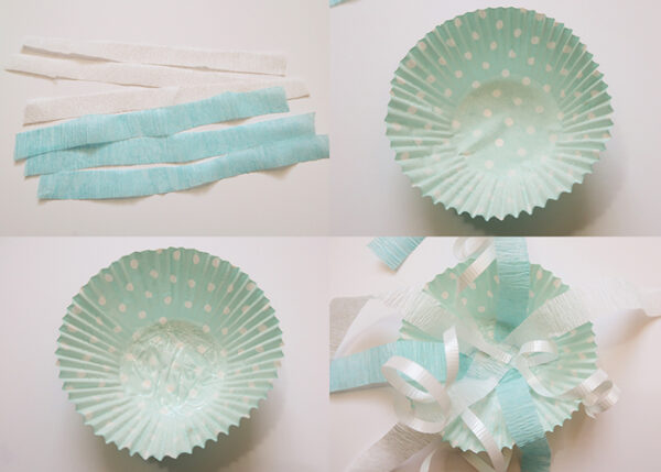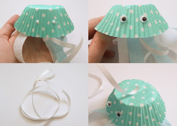 - Glue the strips of paper inside the cupcake liner- not on the walls, but on the bottom as this way the jellyfish umbrella will stand out more (and look cuter).