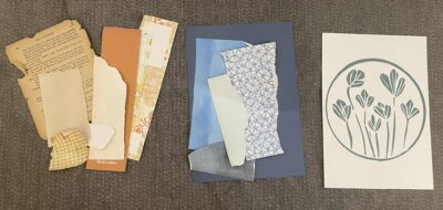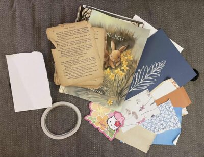 A mix of paper ephemera (colourful/patterned paper, old letters, tickets, packaging, magazines, etc)