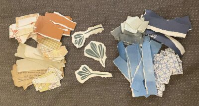 Step 3) Get tearing! Tear up your chosen ephemera into strips that fit on your paper, and sort them into colour piles. For the sea, tearing messily will get you that wonderful bit of white, which looks like waves!