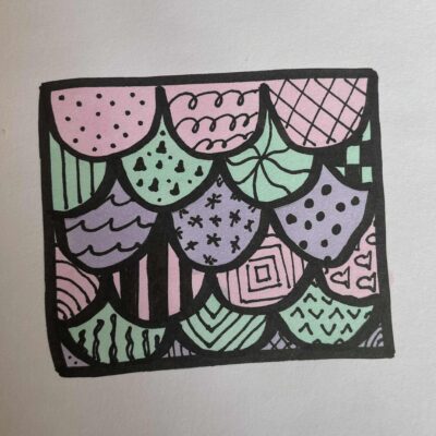 Step 5) Draw patterns in each of your scales. Take your time and enjoy this stage! You could do a totally new pattern for each scale, or mix and match a few favourites. When coming up with your patterns, experiment with mixing different line thicknesses, shapes, and directions. Here are some ideas: