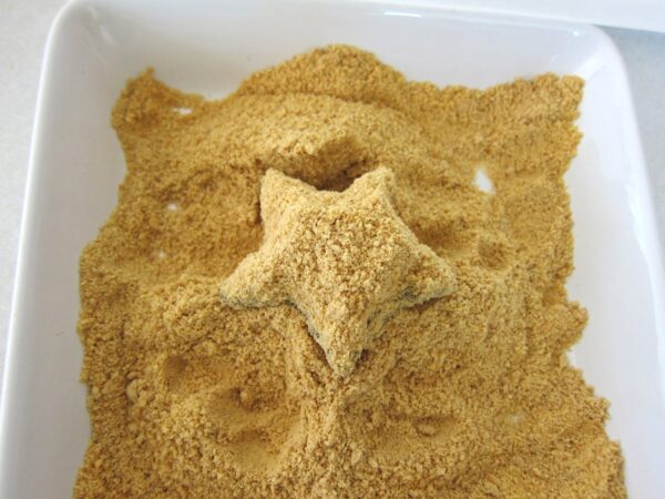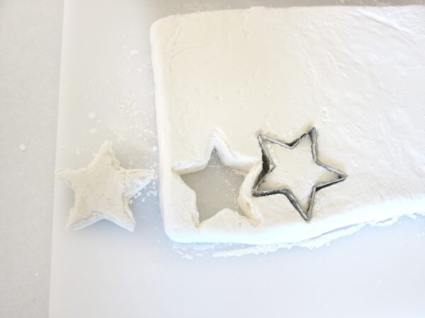 1. Turn marshmallow out onto a cutting board, cut into star shapes. For store bought, square shaped work best, cut into star shapes with cookie cutter or knife. If you only have classic round available, a rolling pin can be used to flatten them.